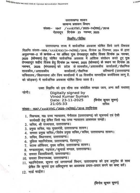 देहरादून। उत्तराखंड शासन के सामान्य प्रशासन विभाग ने गुरु तेगबहादुर शहीद दिवस पर घोषित अवकाश में संशोधन करते हुए नया आदेश जारी कर दिया है। पहले यह सार्वजनिक अवकाश 24 नवंबर 2025 (सोमवार) को तय था, जिसे बदलकर अब 25 नवंबर 2025 (मंगलवार) को घोषित किया गया है।
