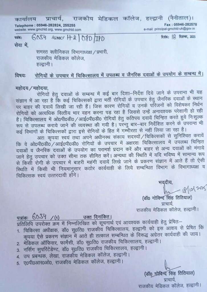 हल्द्वानी। राजकीय मेडिकल कॉलेज प्रबंधन ने डॉ. सुशीला तिवारी चिकित्सालय (एसटीएच) में मरीजों के आर्थिक हितों की सुरक्षा और बेहतर उपचार व्यवस्था सुनिश्चित करने के लिए चिकित्सकों के लिए कड़े निर्देश जारी किए हैं। प्राचार्य डॉ. गोविन्द सिंह तितियाल ने सभी क्लीनिकल विभागाध्यक्षों और चिकित्सकों को आदेशित किया है कि ओपीडी एवं आईपीडी में भर्ती मरीजों के इलाज में केवल चिकित्सालय में उपलब्ध चिन्हित एवं जैनरिक दवाओं का ही प्रयोग किया जाए।